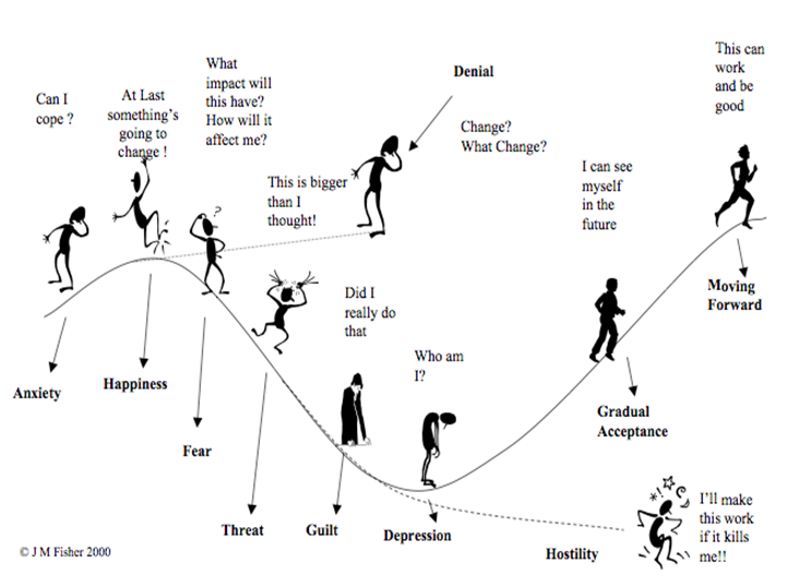 This has been a challenging couple of years in my family – Grandma was the third person in our close circle who had passed on in the last 18 months. As a result, I have gotten more and more accustomed to managing change – I have come to expect the wave of emotions sweeping myself and those around me; I have started to look for the joy in the situation, as there always is; I have been able to help others accept what is happening as well. As the graphic above makes obvious, it is very possible to get “derailed” from the natural process of change, into denial or hostility. Even more common is to get “stuck” in a certain feeling – the nervous feeling of guilt that never quite goes away; the fear or anxiety around the future; the depression. The model described above is a take-off from Dr. Kubler-Ross’ work on grief and transition; she wrote her book On Death and Dying in the 1970s, and her thinking was an enormous contribution to understanding transition and change of all types.